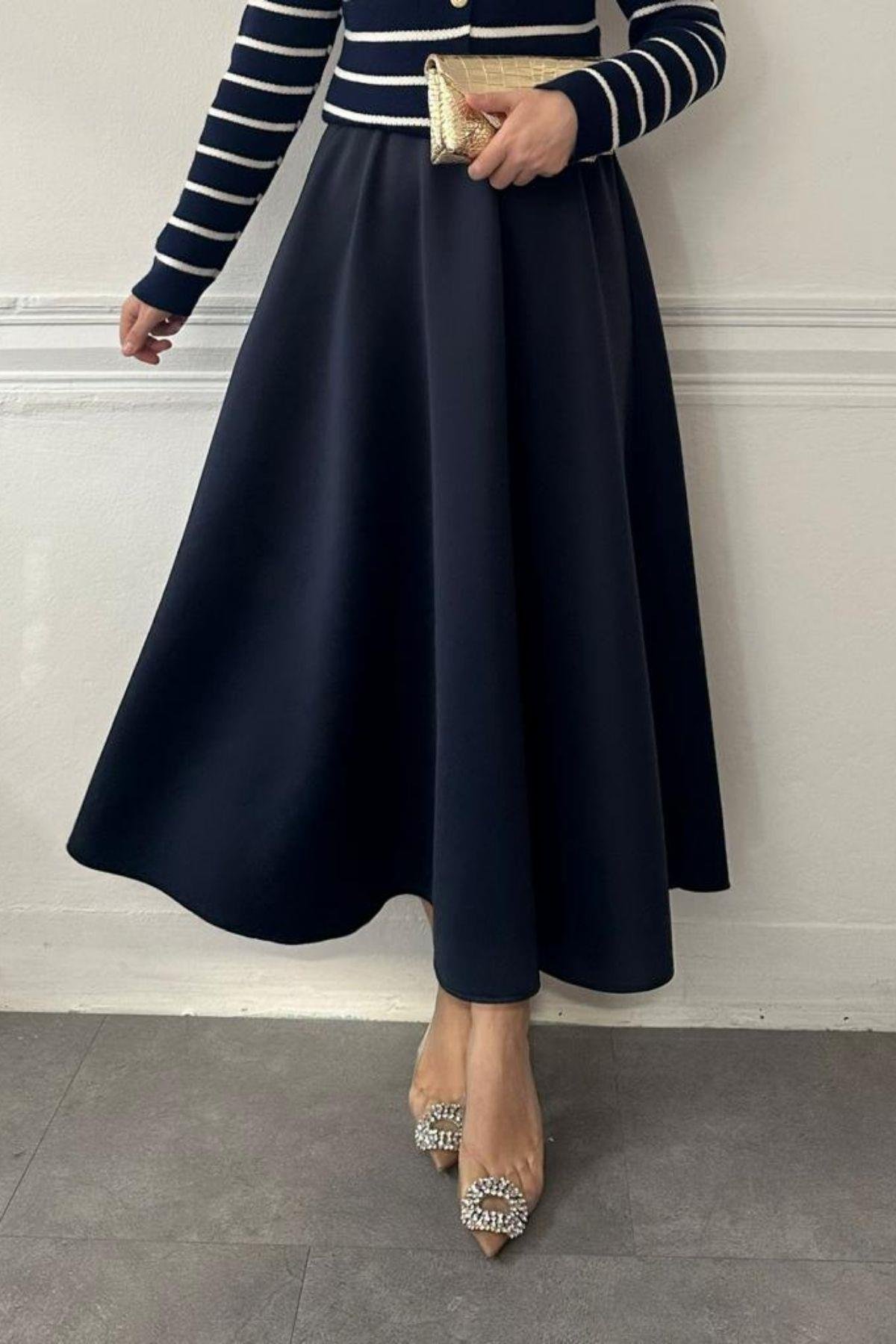 Zarif kesimi ve dökümlü yapısıyla öne çıkan Çan Etek, hem günlük hem de şık kombinleriniz için ideal bir parçadır. Squba krep kumaşı sayesinde formunu korur, rahat bir kullanım sunar.