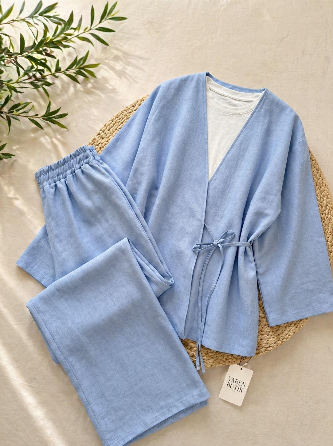 Minimal ve zarif görünümüyle öne çıkan bu takım, pamuklu keten dokulu kumaşı ve rahat kalıbıyla konforu şıklıkla buluşturuyor. Günlük stilinizde sade ama güçlü bir görünüm oluşturur.