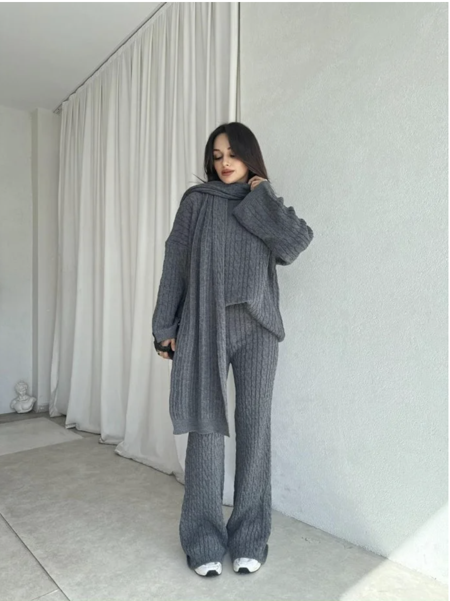 Soğuk kış günlerinde ve mevsim geçişlerinde hem şıklığı hem de rahatlığı bir arada sunan Atkılı Triko Takım, yumuşacık dokusuyla gün boyu konfor sağlar. Modern kesimi ve takım ile uyumlu şalı sayesinde tek parçada zahmetsiz şıklık elde etmenize yardımcı olur.