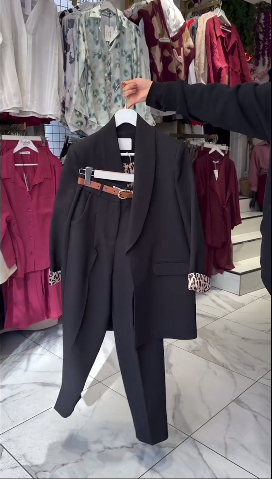 Leopar Şal Yaka Blazer Ceket ve Pantolon Takım, modern kadının her ortamda özgüvenle yer almasını sağlayan özel bir kombin. Kaliteli double krep kumaşı, leopar desenli iç astarı ve tok duruşu ile hem konforu hem şıklığı bir araya getiriyor.